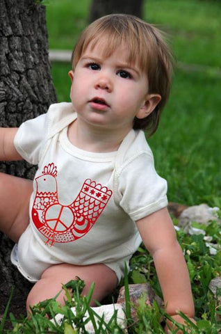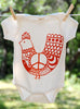 Organic Cotton Baby Onesie, Red 'Peace Chicken' on Natural Onesie