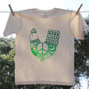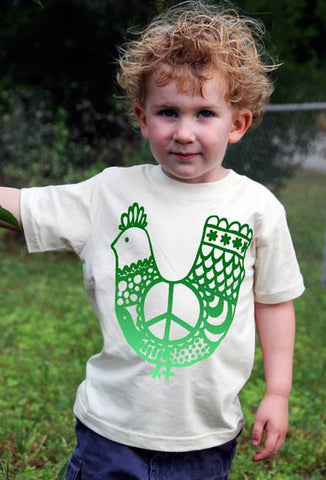 Natural-colored organic tee-shirt, hand-screenprinted with an original peace chicken design in green using water-based ink.